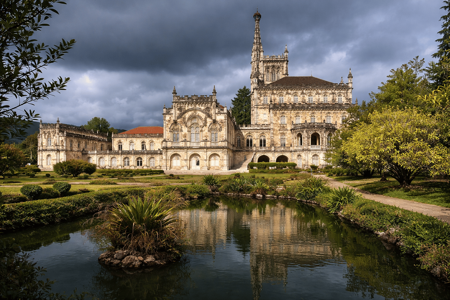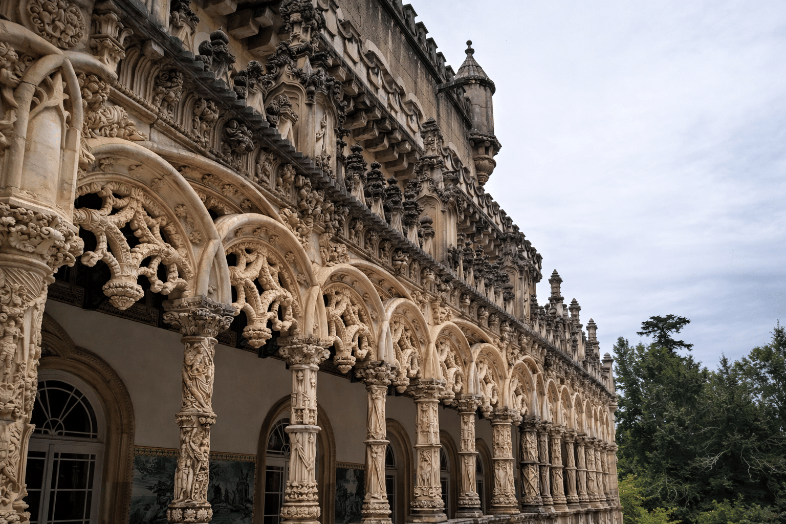 The visit continues with an exterior guided interpretation of the Buçaco Palace Hotel, an iconic building rising unexpectedly from the forest. Designed by Luigi Manini in a neo-Manueline style, the palace evokes Portugal’s maritime heritage through its ornate stonework and fairytale presence.